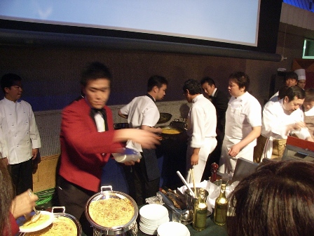 このパーティの目玉は、有名シェフたちによるイタリアン対中華の料理対決だった。お祝いにかけつけたシェフたちがスーツ姿からコック服に着替え、大粒の汗をかきながら自慢の一品を次々に提供していく。しかも、アナウンサーやシェフによる実況中継つき。